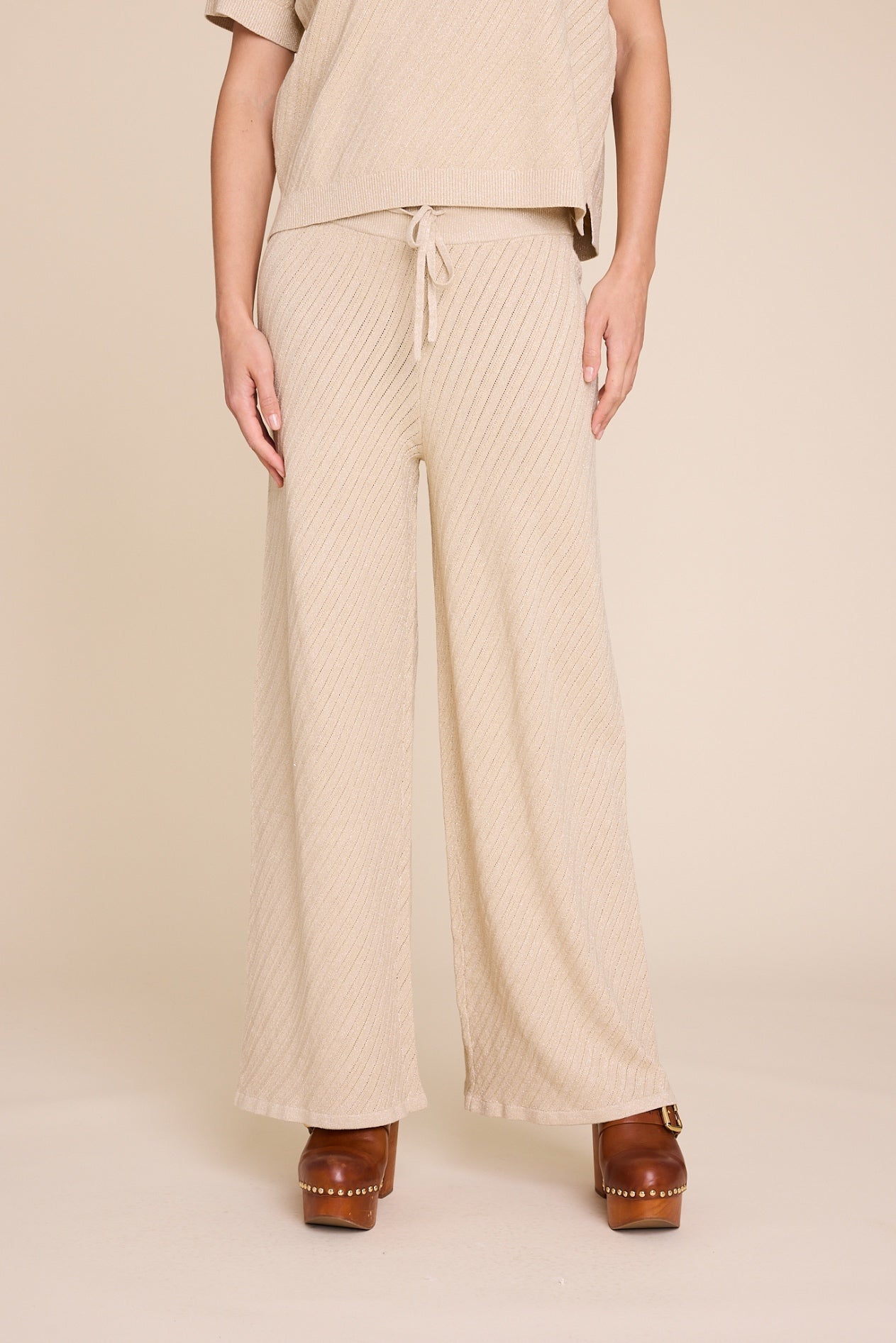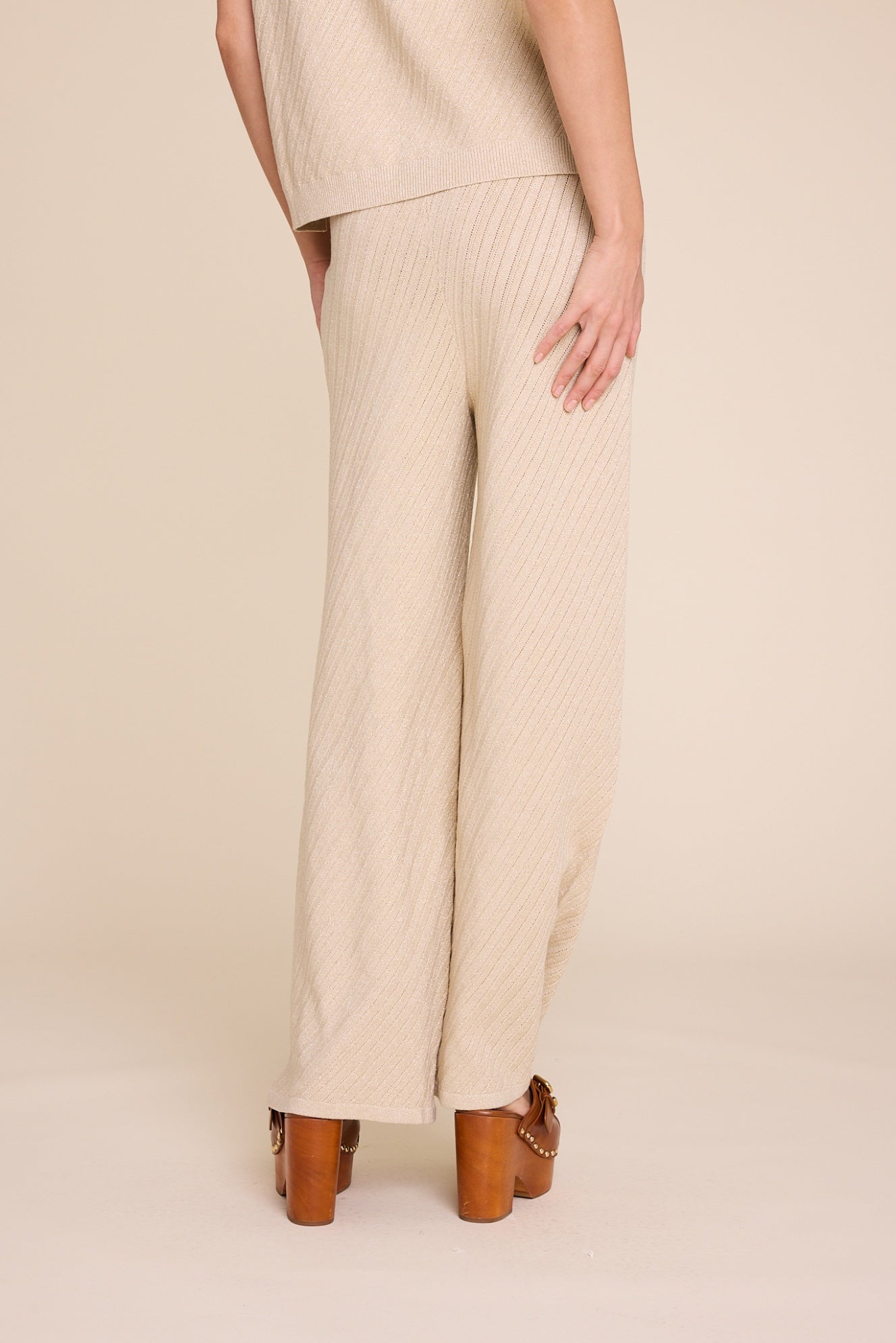 Våre favorittbukser: Holmes, er tilbake! Nå i en vakker gullfarge med subtile glitterdetaljer. Buksene har rett, avslappet passform med elastisk linning og knyting i livet for god komfort. Perfekte å style både opp og ned. Kombiner dem med den matchende