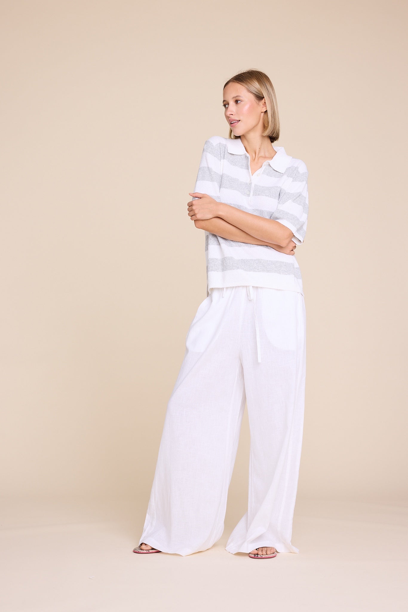 Yasmin strikkede t-skjorte er laget i en myk bomullsblanding som føles lett og behagelig på. Den har en markert krage, V-hals med knapper og sidesplitter som gir en avslappet passform. Perfekt å style med favorittjeansen din eller bruke under en blazer for en enkel og gjennomført hverdagslook.