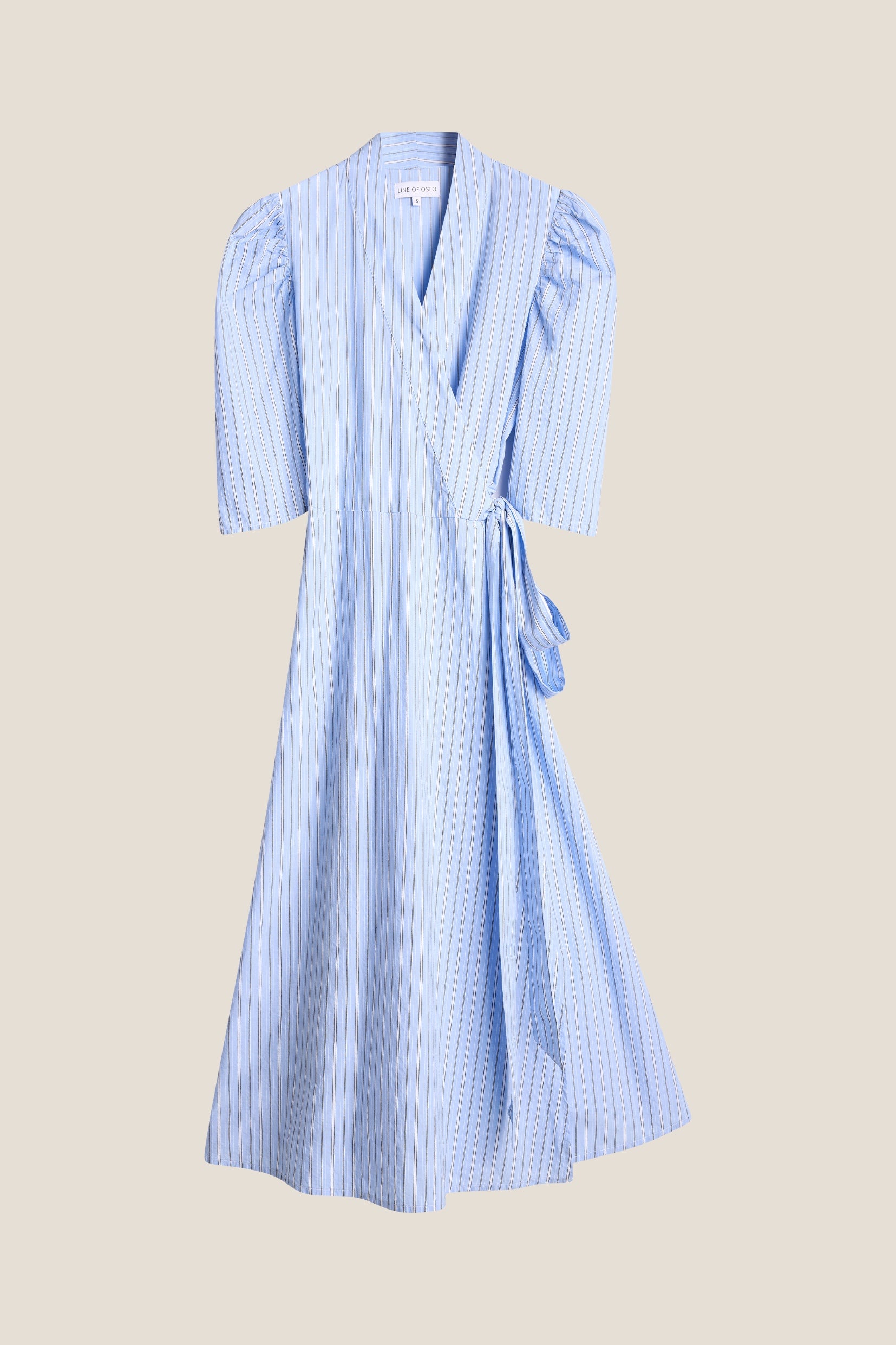 Scarlett er tilbake – nå i striper og laget av myk 100 % bomull. Denne elegante omslagskjolen har litt voluminøse skuldre, praktiske sidelommer og knappelukking på brystet for ekstra sikkerhet. Et tidløst plagg, perfekt for hverdagsgarderoben din og lett å pynte seg med.