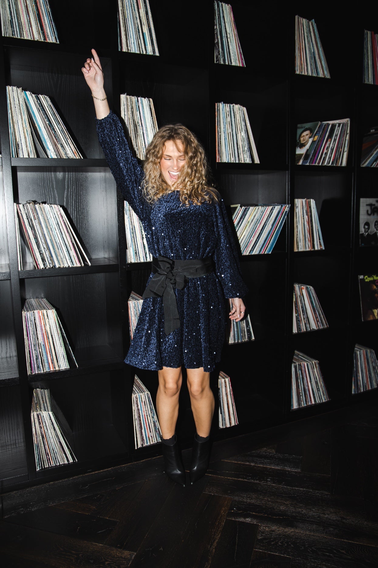 Luna Paljett: Vår fantastiske kjole designet for å imponere. Denne knelange kjolen kombinerer luksuriøs fløyel med paljetter for et virkelig fengslende utseende. Med elastiske mansjetter, knappelukking bak og en A-formet, avslappet passform, tilbyr den både eleganse og komfort.