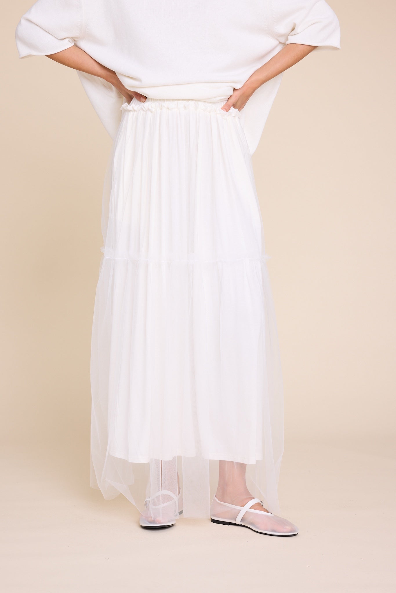Hay Tulle er et vakkert skjørt designet med perfekt A-linjeformet passform og en elastisk linning for komfort hele dagen. Det har et delikat chiffong-overlegg som gir et elegant preg, sammen med en rysjert kant og diskret rynkete tekstur. Kle den opp med en bluse eller skap en kul kontrast med en enkel T-skjorte.
