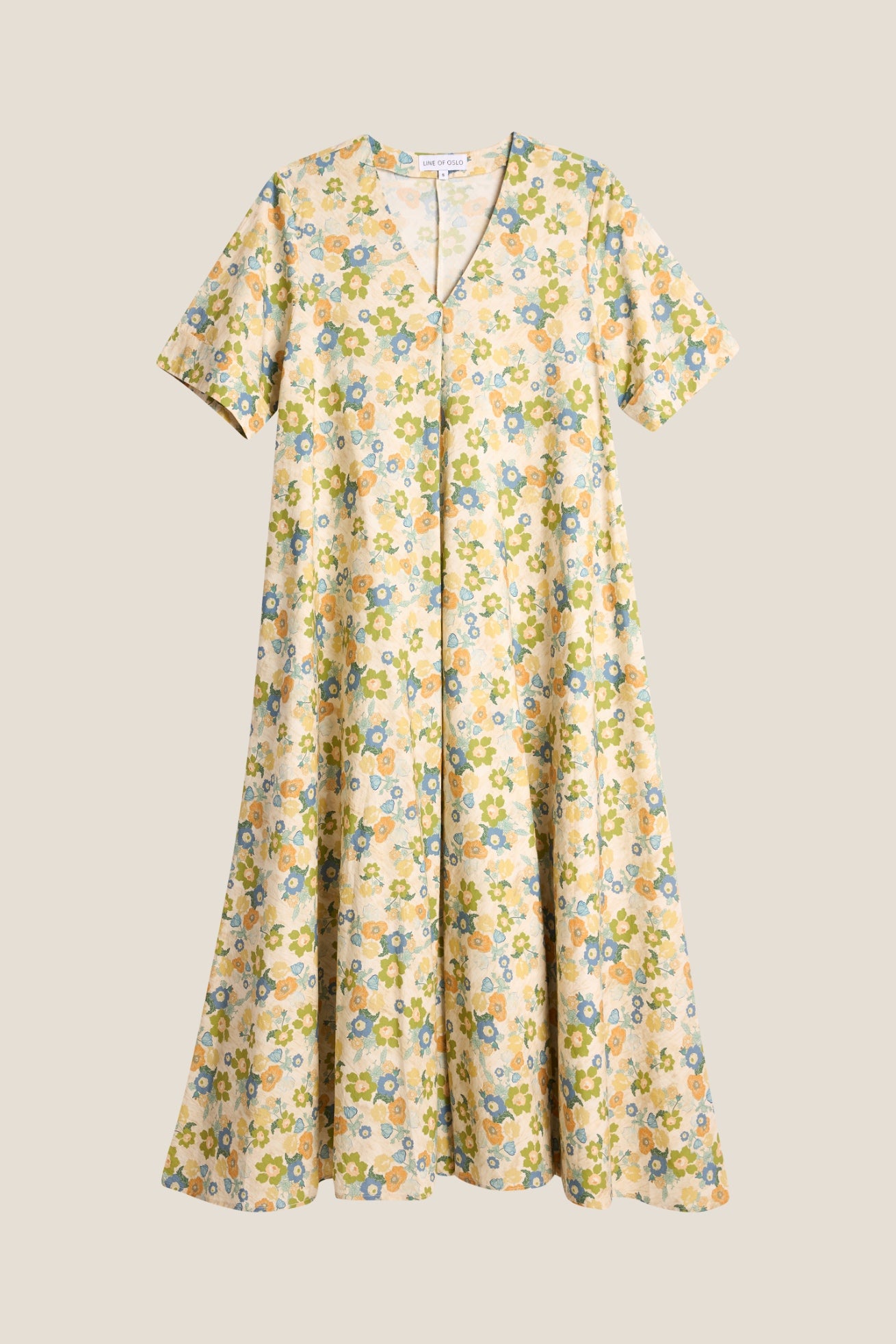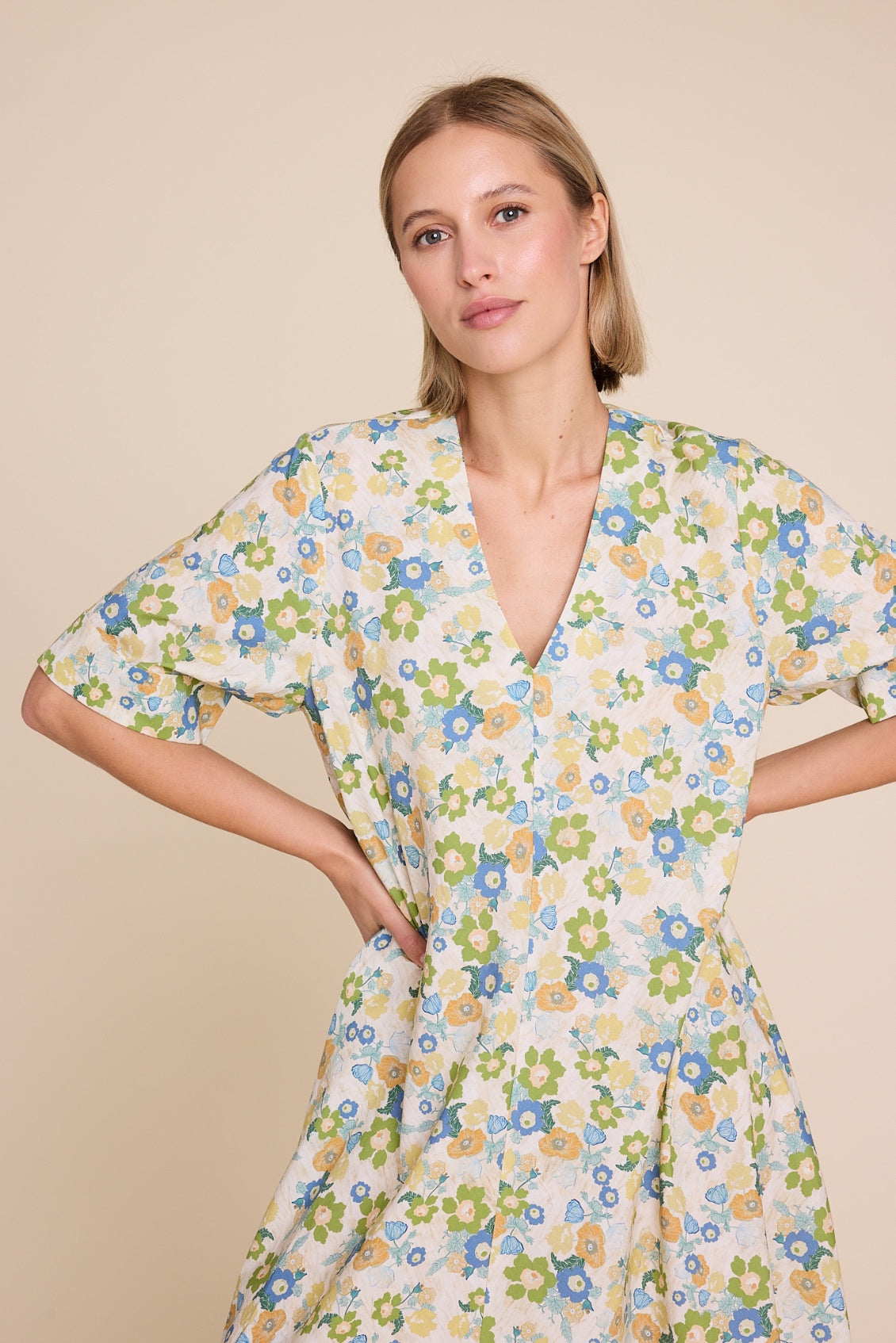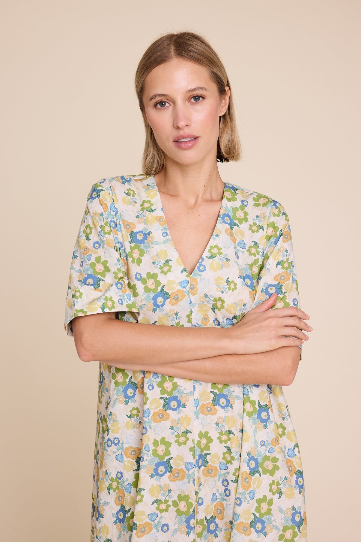 One of our bestselling dresses is back! Eva Flower is a soft cotton dress with a beautiful floral print. This long dress features a flattering V-neck, an A-shaped silhouette, and practical side pockets. The sleeves have delicate folded details for an elegant touch. A perfect choice for effortless, everyday sophistication.